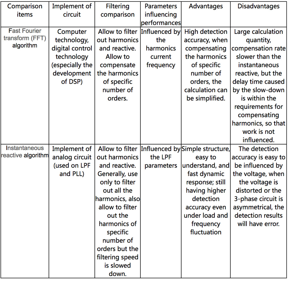 The active filter mainly includes the following two types of typical algorithm modes: the fast Fourier transform (FFT) and instantaneous reactive mode, and these two algorithms have their respective apparent advantages and disadvantages. The core of the FFT-based digital analysis is how to extract the fundamental component and harmonic component from the currents. Its principle is that the signals in one period are decomposed through FFT to obtain amplitude and phase of different orders of harmonics. The advantages of this method are: the amplitude and phase for each order of harmonics can be obtained once for all, and the number of order for harmonics necessary to be compensated and the proportion of compensation can be freely selected. Its main drawback is that a period of sampling data must be obtained for calculating the content for each order of harmonics. The error signals have to be reconstructed, requiring complex computation and causing great delay. On the other hand, the harmonic extraction method is based on Fourier analysis, the compensated waveform must be subject to cycling change, otherwise greater error will be caused, which also limits the use of the product. The core idea of the detection method based on instantaneous power theory is to extract the current harmonic components using the relationship between the voltage and current in the system. This harmonic detection method may be completely free of delay when only detecting reactive current. When detecting harmonic currents, certain delay exists as the composition of the detected harmonic and the used filter are different, but such delay does not exceed one power frequency period. However, the instantaneous power theory is put forward based on three-phase balance system. According to the existing theory, the three-phase currents can not be independently detected and controlled in the three-phase four-wire system.