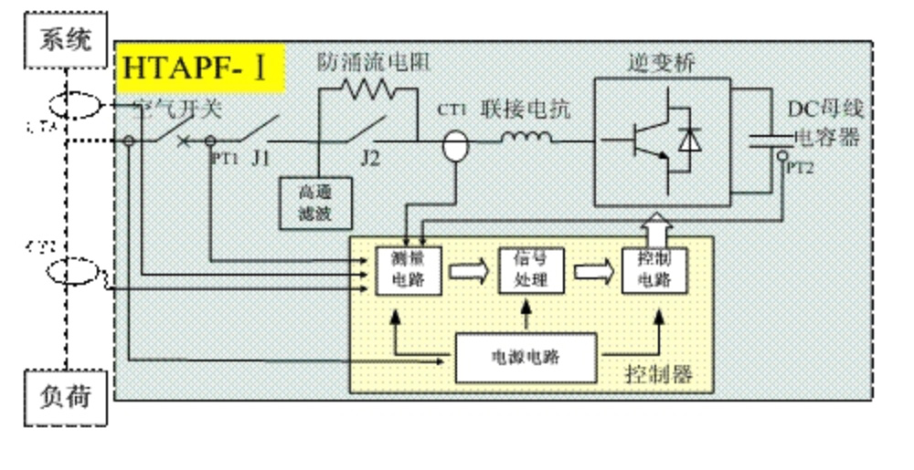 Our active filter has the following functions during normal operation: eliminate harmonic current generated by non-linear loads, compensate reactive power of backward load and operate as dummy resistor to avoid resonance damage.